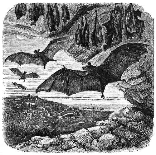 Among the animals that are forbidden to be eaten by the Israelites we find the Bat prominently mentioned, and in one or two parts of Scripture the same creature is alluded to with evident abhorrence. In Isaiah ii. 20, for example, it is prophesied that when the day of the Lord comes, the worshippers of idols will try to hide themselves from the presence of the Lord, and will cast their false gods to the bats and the moles, both animals being evidently used as emblems of darkness and ignorance, and associated together for a reason which will be given when treating of the mole. The Hebrew name of the Bat is expressive of its nocturnal habits, and literally signifies some being that flies by night, and it is a notable fact that the Greek and Latin names for the bat have also a similar derivation.