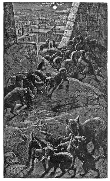 If any animal should be killed, or even severely wounded, the Jackals are sure to find it out and to devour it before the daybreak. They will scent out the track of the hunter, and feed upon the offal of the beasts which he has slain. If the body of a human being were to be left on the ground, the Jackals would certainly leave but little traces of it; and in the olden times of warfare, they must have held high revelry in the battle-field after the armies had retired. It is to this propensity of the Jackal that David refers—himself a man of war, who had fought on many a battle-field, and must have seen the carcases of the slain mangled by these nocturnal prowlers: "Those that seek my soul, to destroy it, shall go into the lower parts of the earth. They shall fall by the sword; they shall be a portion for foxes" (Ps. lxiii. 9, 10). Being wild beasts, afraid of man, and too cowardly to attack him even when rendered furious by hunger, and powerful by force of numbers, they keep aloof from towns and cities, and live in the uninhabited parts of the country. Therefore the prophet Jeremiah, in his Book of Lamentations, makes use of the following forcible image, when deploring the pitiful state into which Judæa had fallen: "For this our heart is faint; for these things our eyes are dim: because of the mountain of Zion, which is desolate, the foxes walk upon it" (Lam. v. 17). And Ezekiel makes use of a similar image: "O Israel, thy prophets are like foxes in the desert."