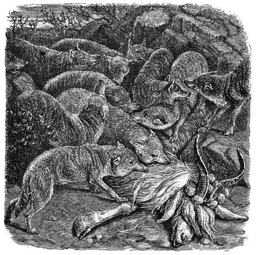 But, collectively, the Wolf is one of the most dangerous animals that can be found. Herding together in droves when pressed by hunger, the wolves will openly hunt prey, performing this task as perfectly as a pack of trained hounds. Full of wiles themselves, they are craftily wise in anticipating the wiles of the animals which they pursue; and even in full chase, while the body of the pack is following on the footsteps of the flying animal, one or two are detached on the flanks, so as to cut it off if it should attempt to escape by doubling on its pursuers.