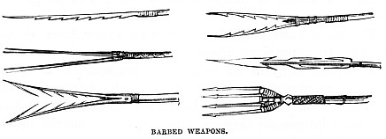 As in this work I prefer to show the gradual development of human inventions, I shall take my examples of barbs entirely from the weapons of uncivilised nations, six examples of which are given in the accompanying illustration, and five of them being drawn from specimens in my collection.