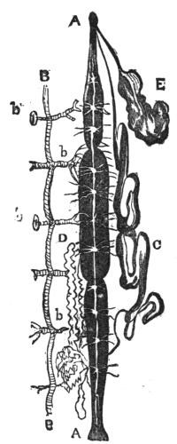 Running in a straight line from head to tail is seen the digestive apparatus, consisting of throat, stomach, and intestines, with their modifications; and this apparatus is marked a a in the cut.