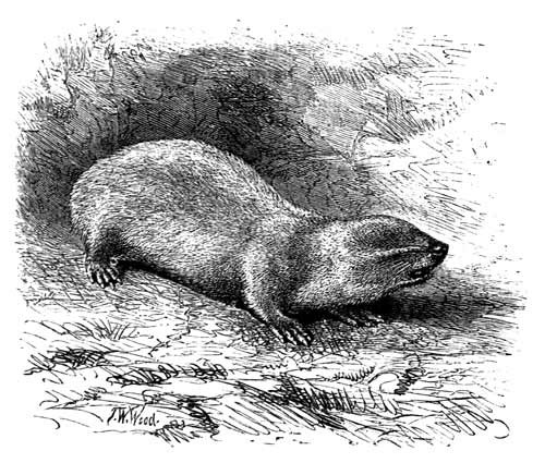 In length it is about eight inches, and its colour is a pale slate. As is the case with the true Moles, the eyes are of very minute dimensions, and are not visible through the thick soft fur with which the whole head and body are covered. Neither are there any visible external ears, although the ear is really very large, and extremely sensitive to sound. This apparent privation of both ears and eyes gives to the animal a most singular and featureless appearance, its head being hardly recognisable as such but for the mouth, and the enormous projecting teeth, which not only look formidable, but really are so. There is a curious superstition in the Ukraine, that if a man will dare to grasp a Mole-rat in his bare hand, allow it to bite him, and then squeeze it to death, the hand that did the deed will ever afterwards possess the virtue of healing goitre or scrofula.
