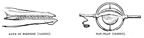 The figure on the right hand of the lower illustration shows a man-trap as it appears when closed, the teeth interlocking so as exactly to fit between each other. The same principle is exhibited in the jaws of the Porpoise, which are seen on the left of the illustration. The jaws of an Alligator or Crocodile would have answered the purpose quite as well, inasmuch as their teeth interlock in a similar fashion, but I thought that it would be better to give as examples the jaws of allied animals. The reason for this interlocking is evident. All these creatures feed principally on fish, and this mode of constructing the jaws enables them to secure their prey when once seized.