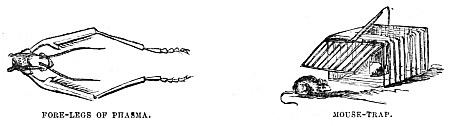 Another example of such teeth is to be found in the fore-legs of various species of Phasma and Mantis, as may be seen by reference to the illustration. The latter insects are wonderfully fierce and pugnacious, fighting with each other on the least provocation, and feeding mostly on other insects, which they secure in their deeply-toothed fore-legs. They use these legs with wonderful force and rapidity, and it is said that a pair of these insects fighting remind the observer of a duel with sabres.