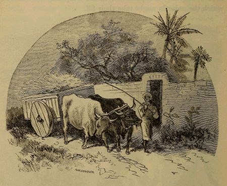 After the corn was threshed, or rather trodden out, the oxen had to draw it home in carts. These were but slight improvements on the threshing-sledge, and were simply trays or shallow boxes on a pair of wheels. As the wheels were merely slices cut from the trunk of a tree, and were not furnished with iron tires, they were not remarkable for roundness, and indeed, after a little time, were worn into rather irregular ovals, so that the task of dragging a cart over the rough roads was by no means an easy one. And, as the axle was simply a stout pole fastened to the bottom of the cart, and having its rounded ends thrust through holes in the middle of the wheels, the friction was enormous. As, moreover, oil and grease were far too precious luxuries to be wasted in lubricating the axles, the creaking and groaning of the wheels was a singularly disagreeable and ear-piercing sound.