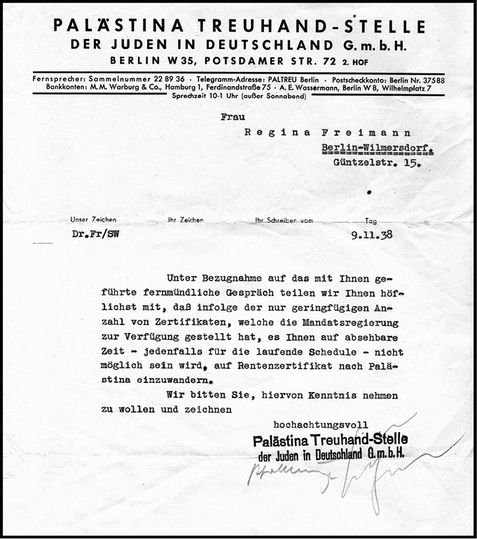 Letter to Regina Freimann from the Palästina Treuhand-Stelle.