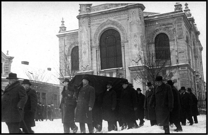 Rabbi Jacob Freimann’s funeral procession outside the synagogue in Holleschau.
