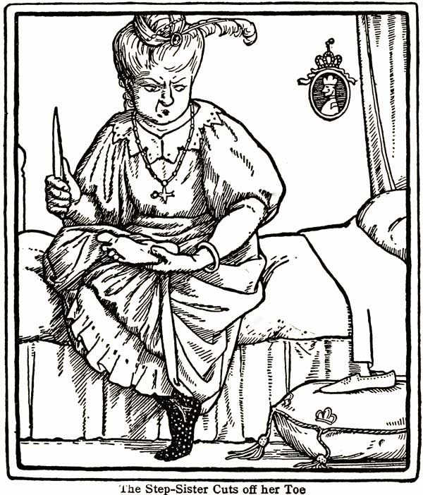 "Turn and peep, turn and peep,There's blood within the shoe;A bit is cut from off the heelAnd a bit from off the toe."And the Prince looked down and saw the blood streaming from her shoe and then he knew that this was not his true bride, and he rode back to the house of Cinder-Maid's father; and then the second sister tried her chance; but when she found that her foot wouldn't fit the shoe she did the same as her sister, but all happened as before. The little bird called out:
