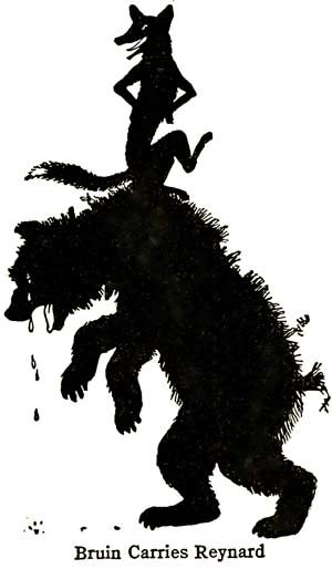 Well, Reynard crept home and found Bruin in such a state, who commenced to grumble and complain that it was all Reynard's fault that he had lost his tail. So Reynard pointed to his own tail and said, "Why, that's nothing; see my tail; they hit me so hard upon the head my brains fell out upon my tail. Oh, how bad I feel; won't you carry me to my little bed." So Bruin, who was a good-hearted soul, took him upon his back and rolled with him towards the house. And as he went on Reynard kept saying, "The sick carries the sound, the sick carries the sound."
