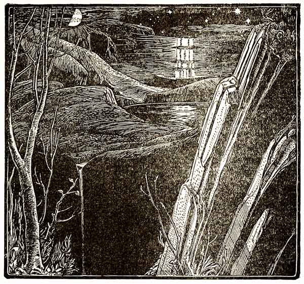 The aunts, meanwhile, were delighted because their nephew did not return; but in a few days he appeared and embraced his sister. Then they had two golden basins made, and put into them the Dancing Water, which leaped from one basin to the other. When the aunts saw it they exclaimed: "Ah! how did he manage to get that water?" and called the nurse, who again waited until the sister was alone, and then visited her. "You see," said she, "how beautiful the Dancing Water is! But do you know what you want now? The Singing Apple." Then she departed. When the brother who had brought the Dancing Water returned, his sister said to him: "If you love me you must get for me the Singing Apple." "Yes, my sister, I will go and get it."