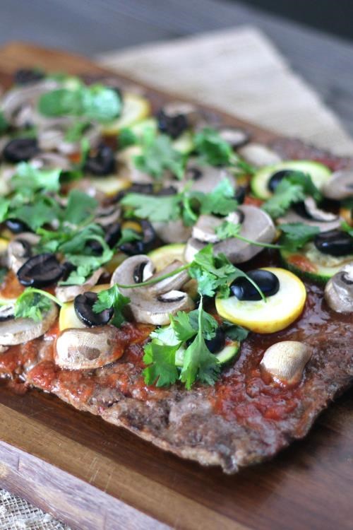 1. ใส่ซอสมะเขือเทศ แอโวคาโดข้น เห็ดหั่นแว่น แครอต บนส่วนผสมแป้ง และโปรยน้ำมันแอโวคาโดเล็กน้อย