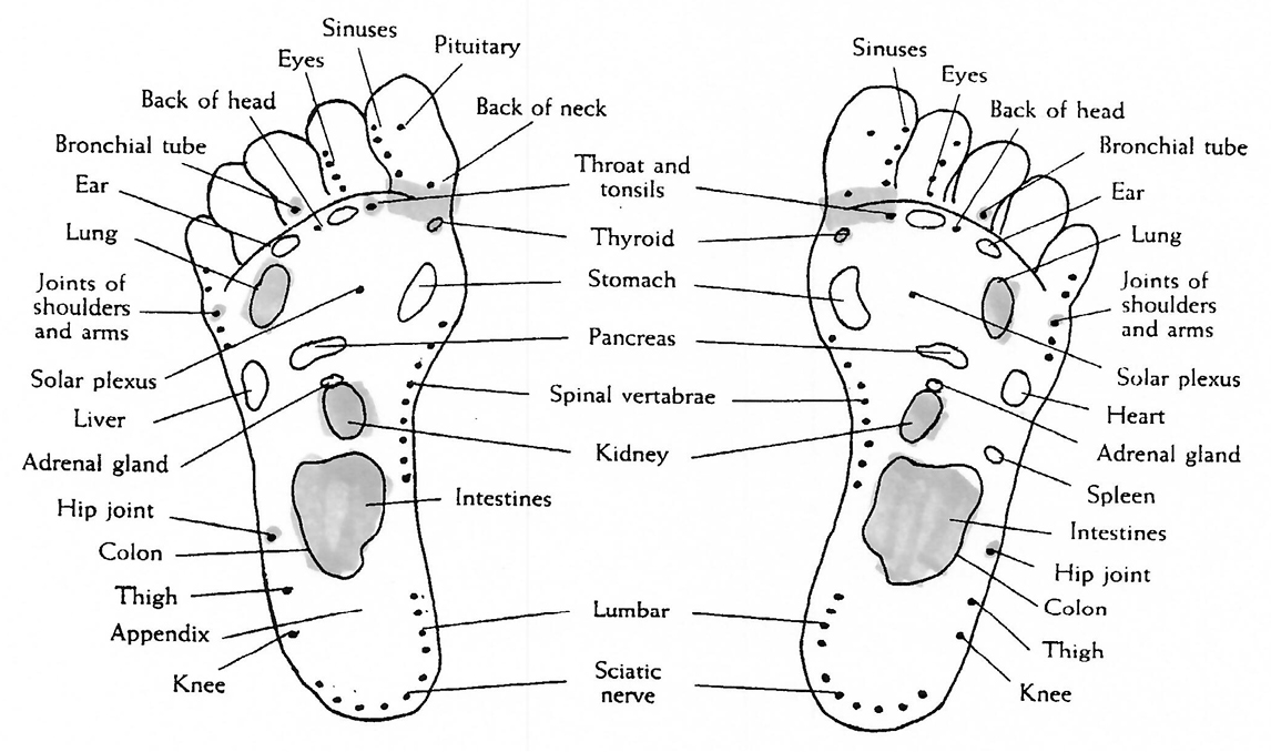 Try to massage all of the foot on a regular basis – the top of the foot as well as the bottom – but pay extra attention to the points highlighted on the chart. When you massage, be aware of ‘sore spots’ as these need special attention. It’s also a good idea to massage the ankles and below them.