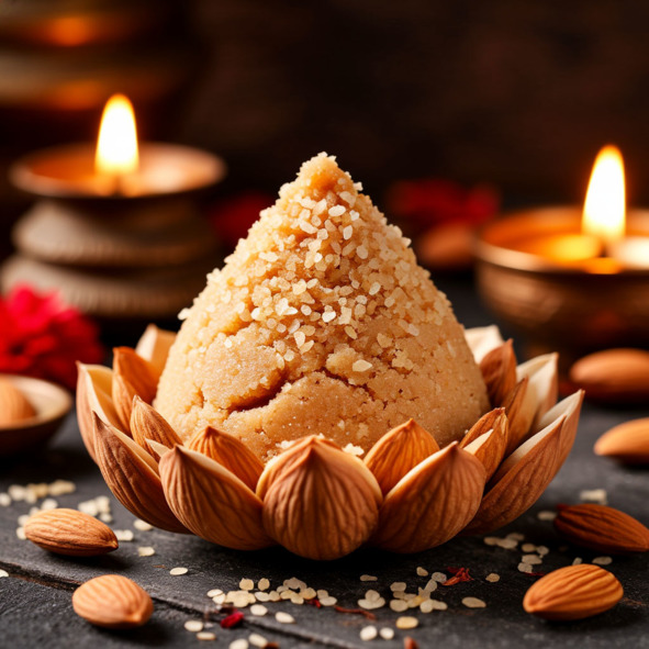 Сладость, пришедшая из глубины земли, вбирает в себя солнечное золото. Миндаль, перемолотый в пыль нежности, соединяется с гхи и молоком, чтобы стать плотью вкуса, уносящей ум в пространство безмятежности. Это – не просто угощение, а прикосновение Венеры к сердцу.