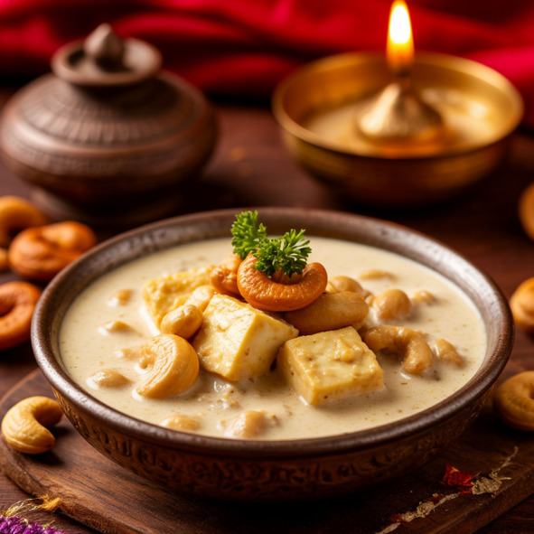 В этом блюде звучит голос Шукра – тот, что соединяет земное и возвышенное. Панир, сотканный из молочного покоя, нежно растворяется в шелке орехового соуса. А кешью – как жемчуг мудрости – придаёт телу насыщенность, а уму – утончённость. Всё здесь приглашает к мягкому вкушению и благостному созерцанию.