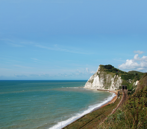 The scenic railway line between Folkestone and Dover burrows through Shakespeare Cliff in a twin-bore tunnel.
