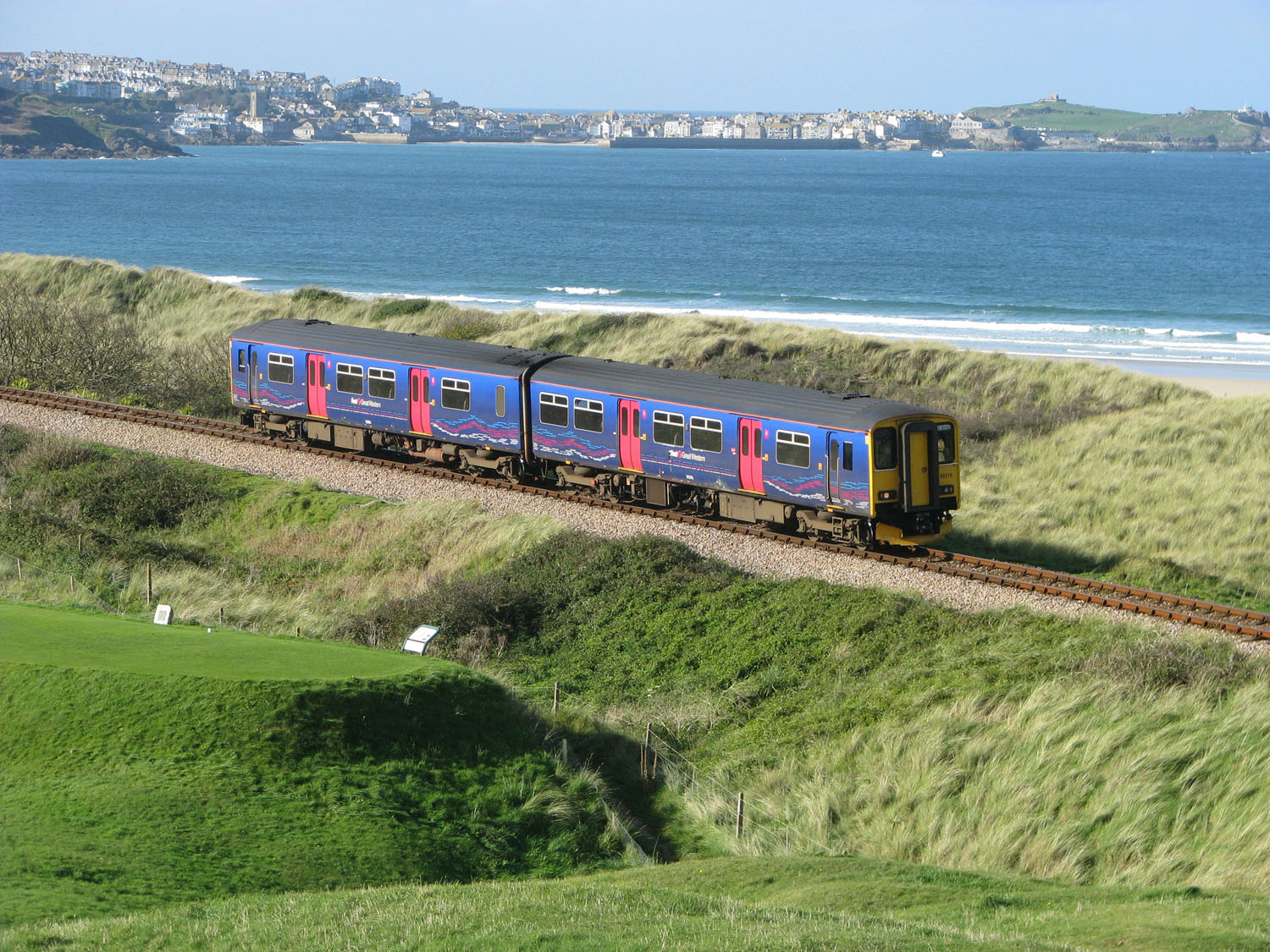 Sandwiched between a golf course and sand dunes, a train for St Ives heads away from Lelant station.