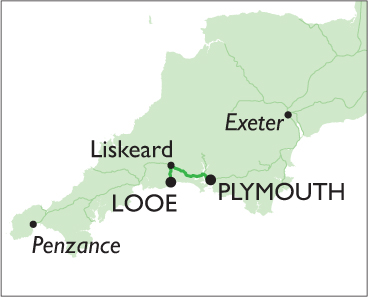 At Liskeard, trains for Looe depart from a separate platform set at a right angle to the main line before descending a steeply graded 180-degree loop, which was opened by the Great Western Railway in 1901, to remote Coombe Junction. Here the guard changes the points before the train reverses direction to head south down the picturesque wooded valley of the East Looe River along the route of the Liskeard & Looe Railway that opened alongside the Liskeard & Looe Union Canal in 1860 – both canal and railway were originally built to carry minerals from mines and quarries on Bodmin Moor down to Looe Harbour. Keeping company with the river and disused canal, the railway passes through request stops at St Keyne Wishing Well, Causeland and Sandplace before slowing for a riverside road crossing at Terras Crossing. The journey ends at the modern minimal station at Looe from where it is but a short walk to the harbour, fish market, beach and quaint narrow streets of East Looe.