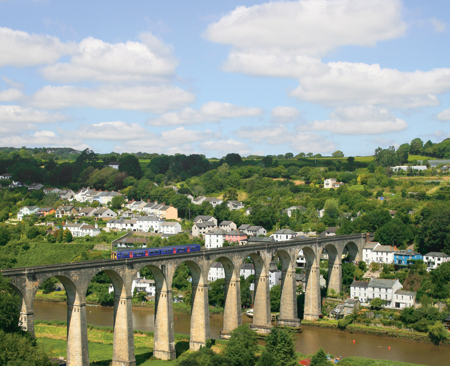 Abounding in sharp curves and steep gradients, the railway soon crosses the Tamar high above on the spectacular concrete 12-arch Calstock Viaduct, which was completed in 1908. After crossing the viaduct, today’s trains call at tiny Calstock station before meandering high above the river to end at the minimal station of Gunnislake. For centuries the village was at the heart of an important industrial and mining region and was also the lowest crossing point of the Tamar until the opening of the Tamar Bridge near Plymouth in 1961. The mining and quarrying ended in the late 19th century and Gunnislake now lies in an Area of Outstanding Natural Beauty.