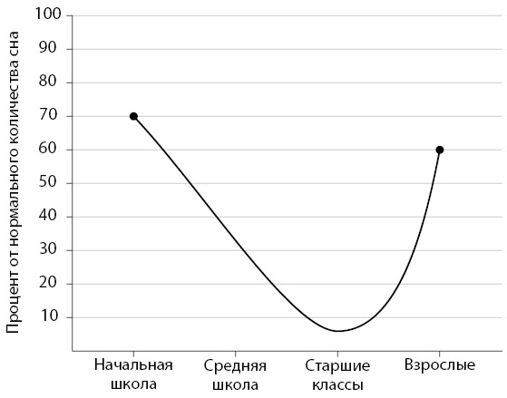 Нет никого, кто страдал бы от недосыпа больше, чем современные подростки. Если в начальной школе[1] оптимальное количество сна получают ежедневно большинство детей, то уже в средней этот показатель резко падает до 30 %. В старших классах нормально спят по ночам всего 5 % подростков. И эти показатели продолжают снижаться. По сравнению с 1991 годом в 2015-м число подростков с серьезными нарушениями сна возросло на 58 %. Ученые решили выяснить, следуют ли подростки базовым медицинским рекомендациям по качеству сна, использованию электронных девайсов и физической активности. Для этого был проведен опрос среди 60 000 американских старшеклассников, и оказалось, что рекомендации соблюдают лишь 3 % девушек и 7 % юношей.