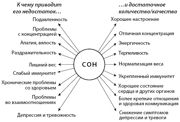 Сон дает жизнь растущему мозгу: способствует высвобождению нейрохимических веществ, – например, серотонина и дофамина, которые отвечают за позитивный настрой, целеустремленность, новые идеи, увлеченность и усидчивость. Сон значительно повышает уровень гормонов, укрепляющих мышцы и восстанавливающих их тонус. Он благотворно влияет на иммунную систему, ослабляет воспалительные процессы и снижает риск хронических заболеваний. Наверное, вы уже подумали, что этот список можно продолжать бесконечно. Что ж, вы не ошиблись. Не существует ни одного лекарства, ни одной пищевой добавки или процедуры, которые давали бы такой же многосторонний положительный эффект, как хороший сон.