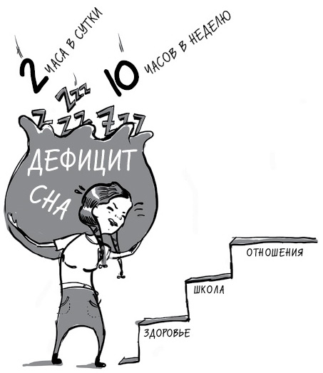 Родители постоянно признаются нам, что сдались. Они понятия не имеют, во сколько их дети ложатся спать и сколько они вообще спят. Телефоны, ноутбуки, компьютеры и игровые приставки в детских комнатах, опасное сочетание школьных занятий, внеклассных занятий, общения и времени, проведенного у экранов, – все это дает в сумме что-то совершенно немыслимое. Сон почти исчезает из жизни подростков.