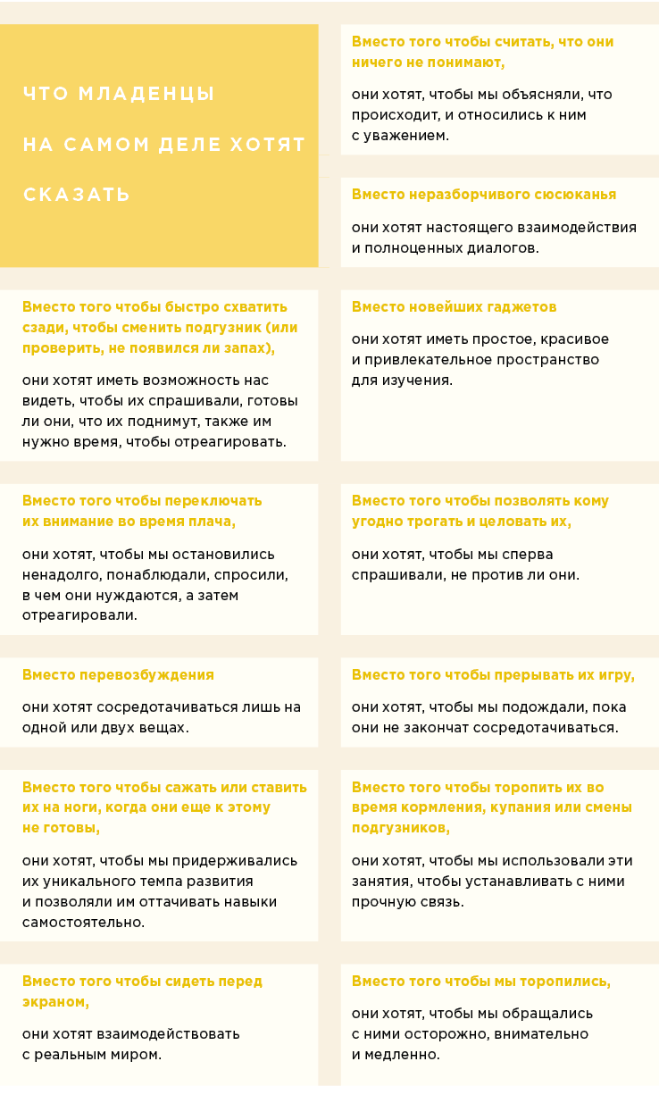 Младенцы говорят, что им нужно. Ребенок не думает: «А подходящий ли сейчас момент, чтобы спросить?» Своим плачем он сообщает, что нужно сменить подгузник, что он голоден, или устал, или что надоело играть. Конечно, на какое-то время мы сможем переключить внимание, но в итоге он все равно продолжит требовать, пока его нужды не удовлетворят. Такая прямота – полезный навык.