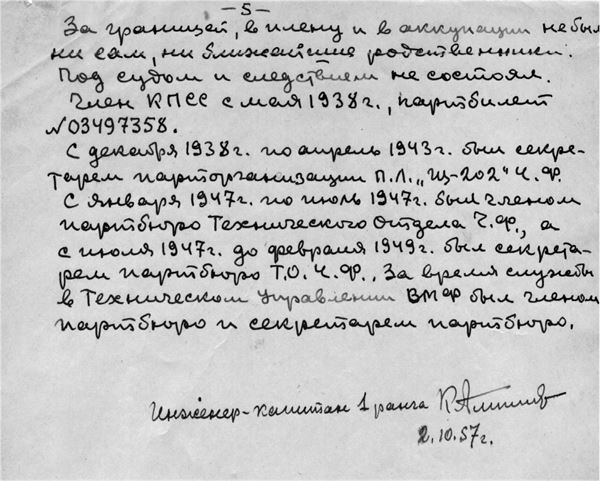 Член ВКП(б) с мая мес. 1938года, п/б № 1959455, принят парторганизацией ВМИУ им. Дзержинского. Партбилет выдан политотделом 1-й БПЛ ЧФ 14.09.38 года. Фамилии рекомендовавших не помню.
