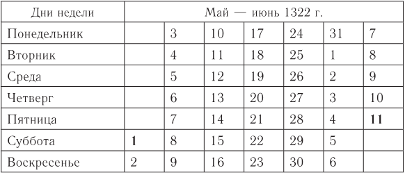 Как следствие этого, к истине гораздо ближе точка зрения В. А. Кучкина, полагающего, что Сергий родился 3 мая 1322 г. С его выводом можно было бы полностью согласиться, если бы не одно но. Выясняя дату появления Сергия на свет, исследователь не обратил внимания на показание Епифания, что между рождением и крещением будущего святого прошло шесть недель («по днехъ шестих седмиц»), иными словами, 42 дня. Вместе с тем агиограф тут же говорит о сорока днях. Это противоречие объясняется тем, что Епифаний при подсчете использовал не привычный нам «включающий» счет, при котором срок отсчитывается с самого момента события, а более древний «исключающий», когда тот или иной период времени исчисляют со следующего дня. Таким образом, оказывается, что будущий святой родился 1 мая 1322 г., а не двумя днями позже, как полагает В. А. Кучкин. Приведенная ниже табличка со всей очевидностью показывает, что между днем рождения и крещения Сергия прошло ровно сорок дней. При этом, если включить в счет сами дни рождения и крещения, в итоге как раз получатся те шесть недель, о которых и говорит Епифаний.[64]