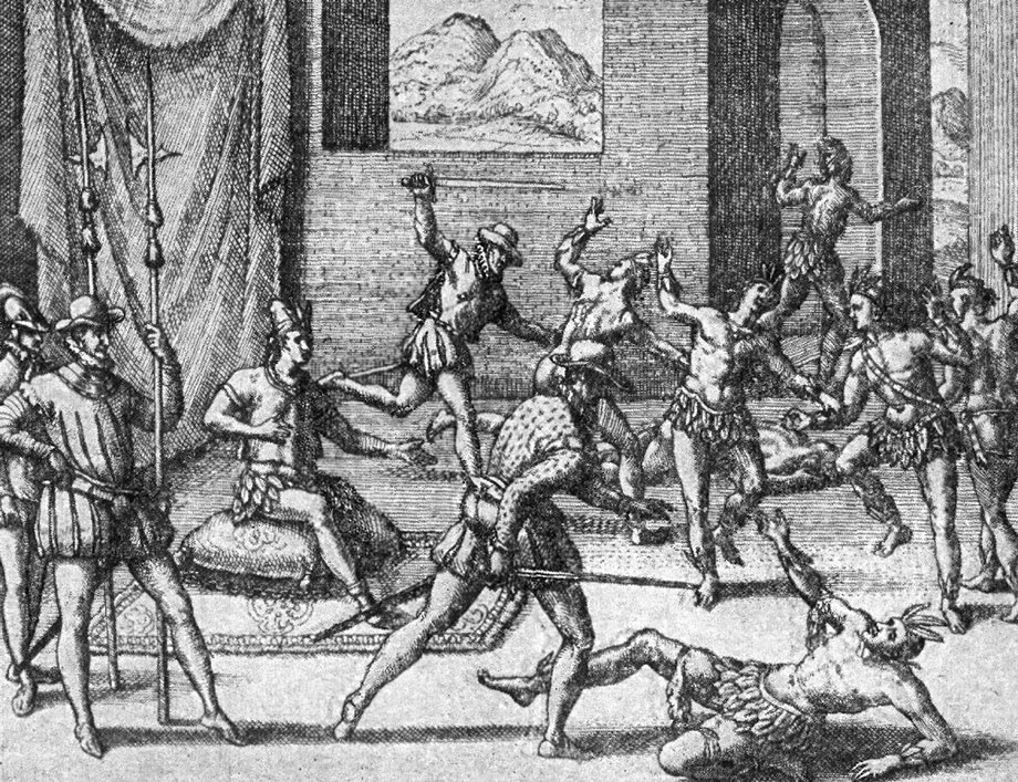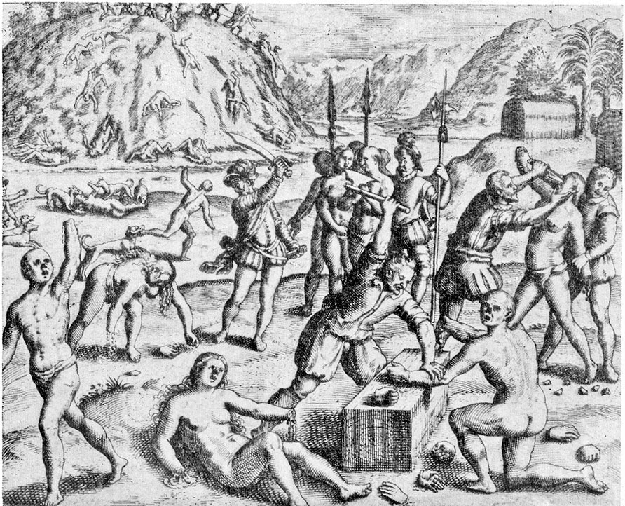 В деталях лас Касас описывал чудовищные ничем не спровоцированные казни. Так, Анакоана – правительница области Харагуа (Гаити) – встретила конкистадоров более чем приветливо, устроив в их честь большой праздник. Их поселили в лучшем доме, подносили им разнообразные угощения. Но это не спасло жизнь ни ей самой, ни ее подданным. Наевшись и напившись, насладившись танцами и песнями, испанцы по сигналу губернатора обманом заманили всех присутствовавших на празднике касиков (вождей) – всего около 80 человек – в большую хижину, заперли там и сожгли заживо. Правительницу повесили, а рядовых жителей перебили. Это было не так уж и сложно: ведь испанцы подготовились к нападению, они были в доспехах и вооружены, а индейцы – наги и безоружны. «Случалось, что некоторые испанцы из жалости или из жадности хотели спасти некоторых детей или подростков от смерти и сажали их на лошадь позади себя, но другие испанцы настигали их и пронзали копьями»[9]. И таких побоищ было немало, испанцы вырезали несчастных индейцев целыми провинциями.