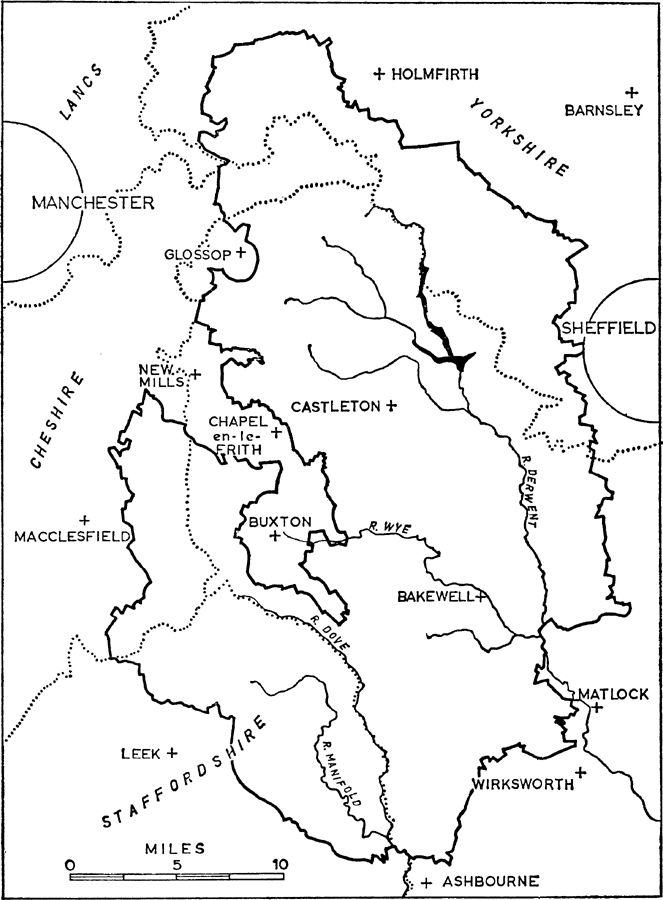 In size The Peak National Park, covering 542 square miles, is not so large as those of the Lake District and Snowdonia, though it is larger than any of the others. It occupies a considerable part of the county of Derbyshire, together with adjoining portions of Staffordshire and Cheshire to the west and the West Riding of Yorkshire, including a small area of the city of Sheffield, to the north (Fig. 1, opposite). Its greatest length from north to south is nearly 40 miles and its greatest breadth about 24 miles. The boundary which delimits the park would enclose a broadly oval shape but for the long narrow wedge reaching far into the interior from New Mills on the western margin to a point about five miles south-east of Buxton. This territory was excluded on the grounds of its predominantly industrial character; in it lie the towns of New Mills, Whaley Bridge, Chapel-en-le-Frith and Buxton, while around the last-named the landscape is seriously marred by intensive limestone quarrying and related lime-works. This feature has the effect within the Park of severing the High Peak of Derbyshire from the hill country of East Cheshire. On the south-east side for a similar reason, though without giving rise to a pronounced wedge, the Matlock and Darley Dale section of the Derwent valley was also excluded. On the south and west the towns of Wirksworth, Ashbourne, Leek and Macclesfield have all been omitted, though they lie only a little beyond the boundary.