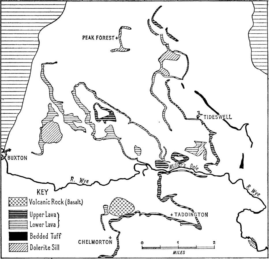 Fig. 3. Volcanic rocks occurring in part of the limestone of the Peak District. (Based on H. H. Bemrose)
