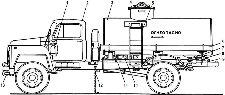 1 – огнетушитель; 2 – шасси автомобиля ГАЗ-53А; 3 – цистерна; 4 – крышка горловины; 5 – лестница; 6 – пенал для рукавов; 7 – отстойник с трубопроводом; 8 – электрооборудование; 9 – узел крепления цистерны; 10 – трубопровод гидравлической системы; 11 – табличка; 12 – цепь заземления; 13 – глушитель