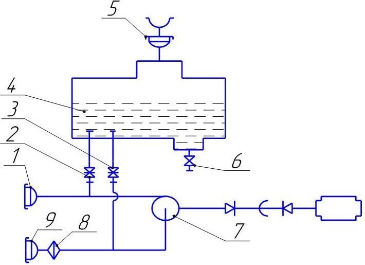 1 – напорный штуцер; 2,3 – задвижка; 4 – цистерна; 5 – дыхательный клапан; 6 – грязевой вентиль; 7 – насос СЦЛ-00; 8 – фильтр предварительной очистки; 9 – приемный штуцер