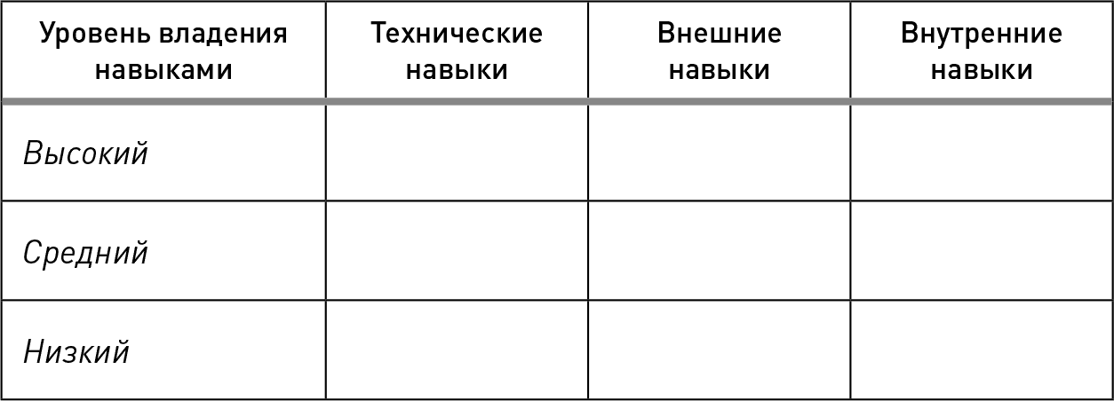Вот диаграмма самооценки, которую я часто рисую для тех, кто посещает мои тренинги, от молодых партнеров до президентов компаний. Я прошу их оценить и себя, и своих подчиненных. Воспользуйтесь случаем, чтобы дать оценку своим техническим, внешним и внутренним навыкам в приведенной ниже таблице.
