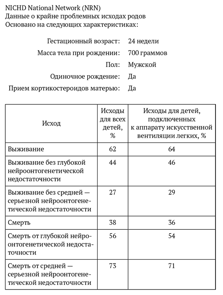Существуют статистические данные о возможных результатах использования интенсивной терапии. Таблица 1 иллюстрирует те из них, которые предложены на общедоступном веб-сайте. В таблице представлено раскрывающееся меню для пяти факторов риска, таких, например, как гестационный возраст плода и вес при рождении. В первой строке указана вероятность выживания младенца (в этом примере – 62 %). В следующих двух строках указана вероятность выживания без тяжелой инвалидности (44 %) и без инвалидности от средней формы до тяжелой (27 %). Последние три строки дополнительно показывают вероятности смерти и инвалидности. Это – мрачная статистика, но она не настолько трагична, чтобы исключить интенсивную терапию из предложения услуг, оказываемых пациентам в случаях, подобных описанному выше.