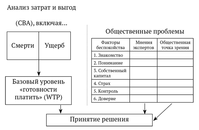 Люди часто ругают себя за то, как плохо они выявляют свойственные им риски первостепенной важности. Однако трудно оценить риски без четкого общего определения риска, выражающего основные ценности, подобно тому, как это предлагается сделать EPA (Агентством по охране окружающей среды, США) и Казначейством Ее Величества. Без такого определения думать о многих рисках одновременно означает не проанализировать серьезным образом ни один из них. В жизни люди обычно «с грехом пополам доводят дело до конца», ожидая, пока какое-либо событие (например, наводнение или жара) привлечет их внимание. Обдумав напомнившее о себе событие, сопряженное с риском, они повышают или понижают для себя его приоритет, а затем идут дальше, даже не определяя риск явно. Таким образом, наблюдение за аварией может убедить водителя решить, является ли посторонний звук в моторе его автомобиля просто раздражающим слух или достаточно серьезной причиной, чтобы потребовать немедленного ремонта. Тревожный новостной репортаж может побудить школьный совет выяснить, является ли подготовка к пандемии неотложной задачей или этот вопрос может быть отложен на неопределенное время, учитывая актуальность других рисков, с которыми он сталкивается (пищевое отравление, насилие, прогулы школьников).