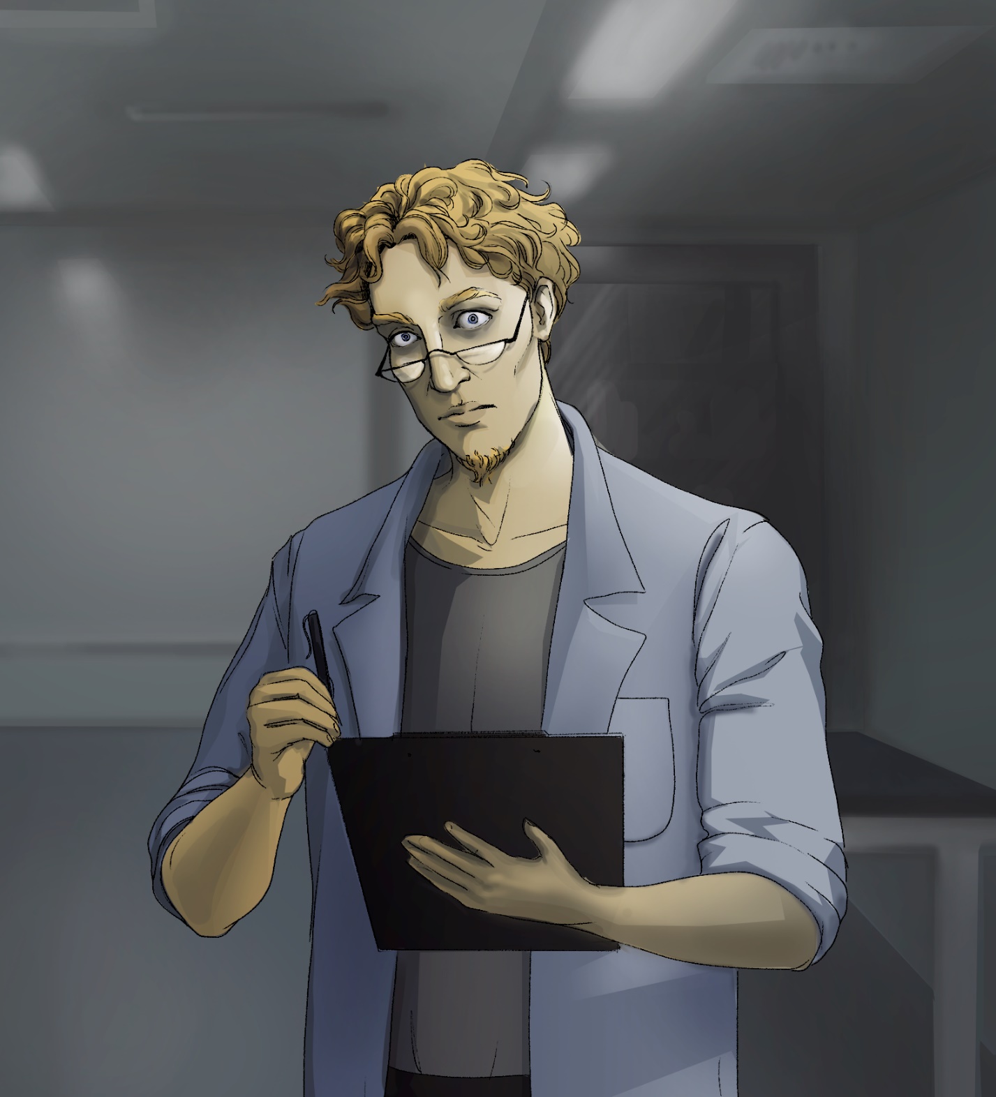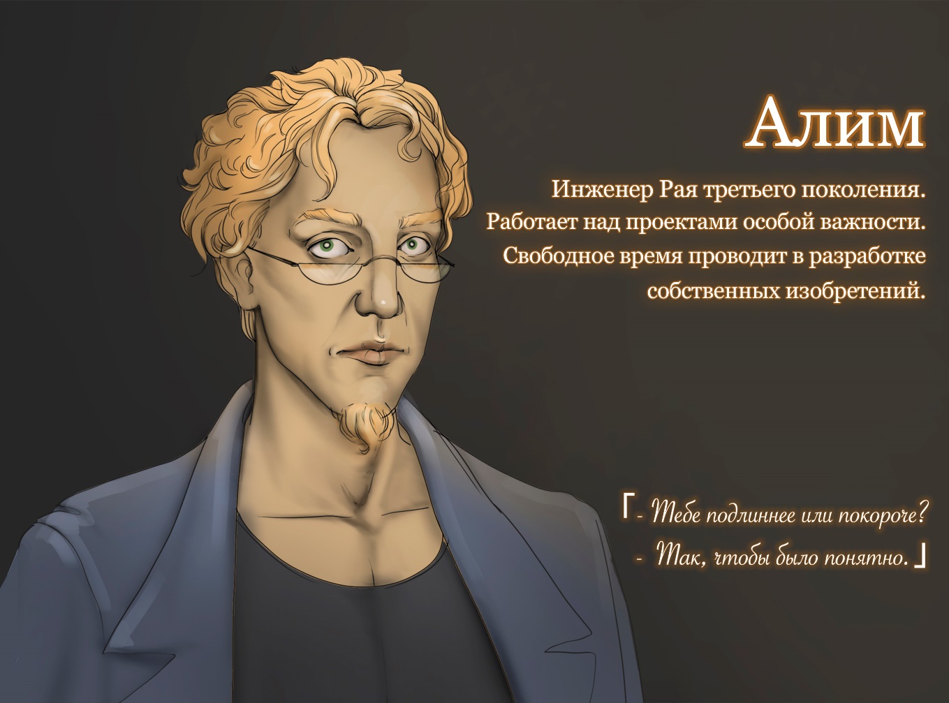 Алимом оказался тот же инженер, что помогал его встать и сопровождал до места боя. Высокий лоб, золотистого цвета волосы небрежно топорщились во все стороны. Зелёные глаза с неподдельным интересом рассматривали Прототипа, можно было даже сказать, что он пялился. Бледная кожа явно говорила, что Алим редко видел солнечный свет. Серый лабораторный халат был слегка потрёпан, а на правом рукаве виднелся след от ожога.