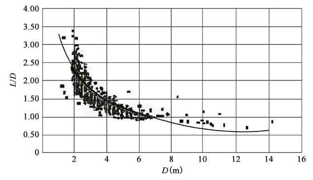 Взаимосвязь между L и D показана на рис. 3-14. Из рисунка видно, что когда внешний диаметр D оболочки корпуса щита < 7 м, L/D ≥ 1, то чем меньше внешний диаметр D оболочки щита, тем больше отношение L/D. Когда внешний диаметр D оболочки щита корпуса щита > 7 м, L/D < 1, то чем больше внешний диаметр D оболочки щита, тем меньше отношение L/D. Как правило, отношение L/D составляет не менее 0.4. Отношение L/D группы щитов с композитными пластами обычно немного больше, чем у щитов с мягким грунтом.