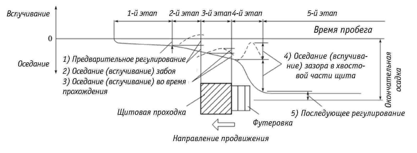 Рис. 3-17. Схема стадий деформации фундамента во время продвижения щита