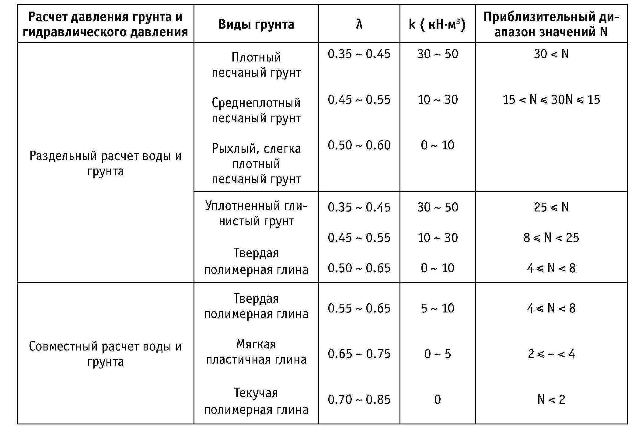 Таблица 4-5. Коэффициент бокового давления грунта (λ), коэффициент сопротивления основания (k)
