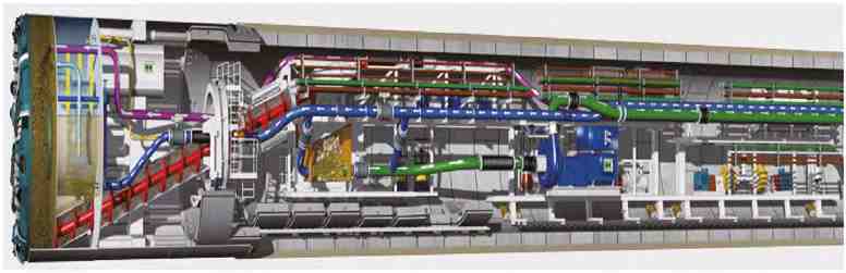 Комбинированная машина для проходки туннелей с использованием жидкой глинистой воды / ТВМ может использоваться как в режиме баланса жидкой глинистой воды, так и в режиме однощитовой ТВМ, в которой щит выгружает глинистую воду через грязевую трубу на ленточный конвейер. Комбинированная машина для проходки туннелей с использованием жидкой глинистой воды / ТВМ показана на рис. 1-32, которая использовалась при строительстве туннеля через озеро Лост в Неваде и туннеля Хернандес в США.