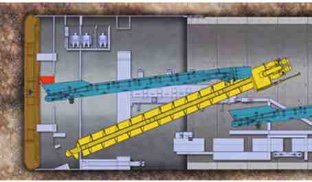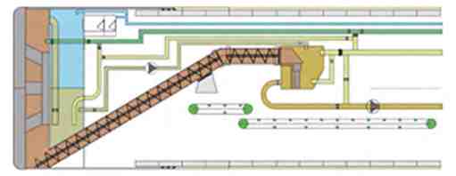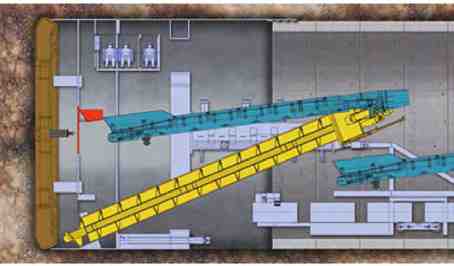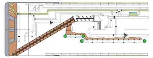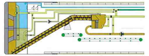 При проходке туннелей в режиме TВM центральный ленточный конвейер выходит в отсек для почвы из центра главного привода, задняя часть рабочего органа оборудована желобом для шлака, а центр отсека для грунта оборудован желобом для шлака. После того, как фреза разрезает породу, шлак попадает в шлакоотвод через скребок для шлака, а затем попадает в центральный ленточный конвейер через шлакоотвод и после этого транспортируется в заднюю опорную зону с помощью соответствующего ленточного конвейера. На этом этапе в центре рабочего органа проектируется водоструйное поворотное устройство для снижения пыли и температуры.