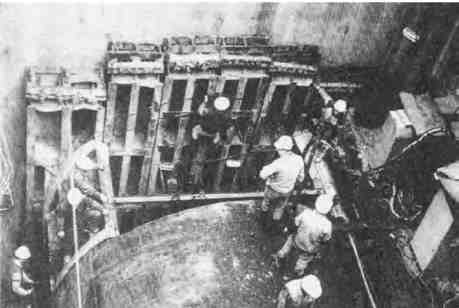 Рис. 1-37. Строительство 3-метрового экструзионного решетчатого гидравлического проходческого щита, изготовленного Цзяннаньским судостроительным заводом. Работы гидравлического проходческого щита (1982 г.)