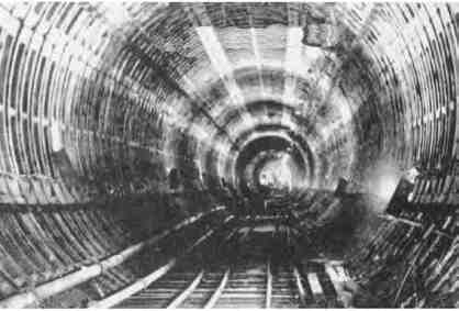 В марте 1965 года были введены в эксплуатацию два 8-метровых решетчатых экструзионных щита, разработанных Шанхайским институтом проектирования туннелей и изготовленных Цзяннаньским судостроительным заводом (рис. 1-34). Два параллельных туннеля длиной 660 м с максимальным оседанием грунта 10 см были введены в эксплуатацию в 1966 году.