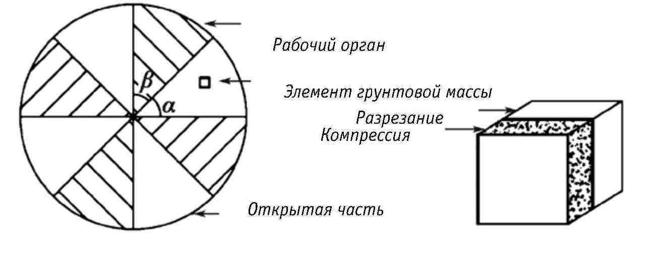 Находящиеся перед плоскостью резцовой головки грунтовые массы подвергаются сдавливающему и разрезающему усилию режущего инструмента щита, при этом может возникать определенная компрессия и переход масс в моментно-пассивное состояние. Однако все грунтовые массы поверхности экскавации могут находиться в разных состояниях в зависимости от разных удерживающих сил во время проходки, так как экскавационный процесс щита – это отслаивание грунтовых масс забоя от их первоначального расположения с помощью режущего инструмента и перемещение их в землеприемный отсек щита с грунтопригрузом (либо в шламоприемный отсек щита с гидропригрузом). В процессе прорезания может возникать временно свободная поверхность, потому что соприкосновение естественной почвы забоя и вырезаемых грунтовых масс не постоянно; на данный момент пока что не удалось найти идеальный способ анализа, кроме создания предположения гипотетически постоянного состояния.