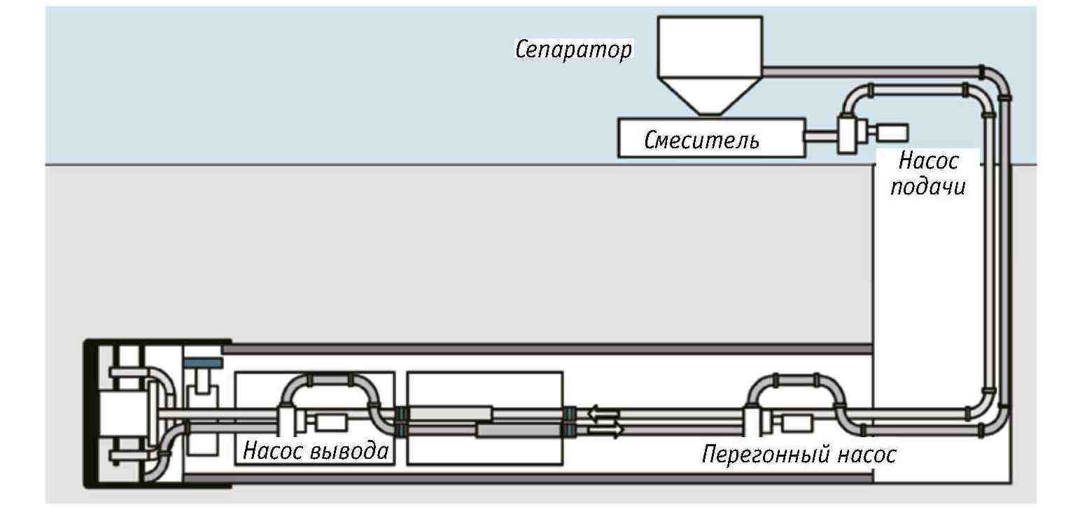 На рис. 2-7 показан процесс работ с помощью проходческого щита с гидропригрузом. Насос подачи выкачивает суспензию (смесь воды и бентонита) из смесительного резервуара, установленного на поверхности, и направляет по трубопроводу в шламоприемный призабойный отсек щита; в заполненном шламоприемном отсеке суспензия под давлением проникает в грунт на несколько сантиметров. Таким образом бентонит внедряется в промежутки между частицами грунта, образуя «корковый» слой, тем самым слой грунта на поверхности выемки становится более стабильным и водонепроницаемым; посредством вращения рабочего органа, ставшая «коркообразной» поверхность выемки разрушается и содержимое смешивается с бентонитовой суспензией, а затем отводится выводящим насосом и перегонным насосом по выводящему трубопроводу в расположенную на поверхности сепараторную станцию; сепараторная станция отделяет шлаковый грунт от бентонитовой суспензии; отделенная от грунта суспензия попадает в смеситель, где проходит определенные качественные преобразования, после которых она может использоваться повторно, а затем вновь направляется подающим насосом в шламоприемный отсек щита.