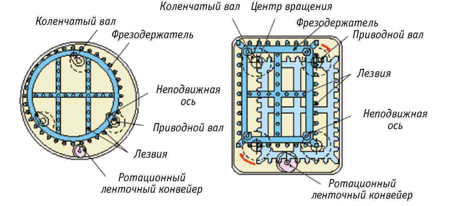 В данном инженерно-техническом подходе используется эксцентрический многоосный проходческий щит, особенностями которого являются: применение многочисленных ведущих валов, перпендикулярно к которым устанавливается набор коленчатых валов. На коленчатых валах монтируются фрезодержатели. Во время вращения ведущих валов, фрезодержатели образуют вращающуюся дугу. Сечение раскопанного участка принимает форму фрезодержателя. Таким образом, в соответствии с требованиями к форме поперечного сечения, форма фрезодержателя может быть круглой, куполообразной, овальной или подковообразной. Схематическое изображение принципов строительных работ эксцентрического многоосного проходческого щита по созданию круглого и квадратного сечения показано на рис. 2-9. На рис. 2-10 показано натуральное изображение описанного проходческого щита.