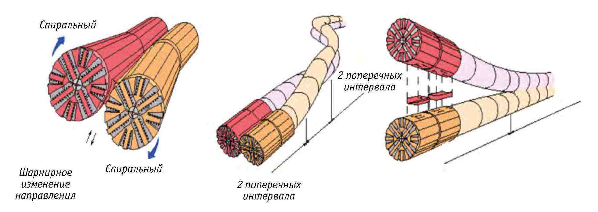 Так называемый проходческий щит H&V ( полное название на английском языке – горизонтальное и вертикальное изменение) представляет собой несколько круглых сечений, которые по мере необходимости комбинируются между собой. Благодаря разработке многочисленных форм сечения туннелей, является особым методом строительства. Проходческий щит H&V можно использовать в строительных работах, как показано на рис. 2-13, спиральный и бифуркационный типы могут одновременно прорывать несколько линий туннелей. Данный способ применения проходческого щита используется в соответствии с условиями строительства и целями применения туннеля, с его помощью, из-за свободного прохождения в толще грунта, можно изменять форму сечения туннеля и его направление. Основной принцип устройства – применение шарнирного соединения вилочного типа, изменяющего направление движения механизма. Механизм позволяет передней части тела проходческого щита самостоятельно вращаться в противоположном направлении. Применение данного вида шарнирного соединения позволяет проходческому щиту создавать крутящий момент, позволяя достигнуть спирального движения вперед.