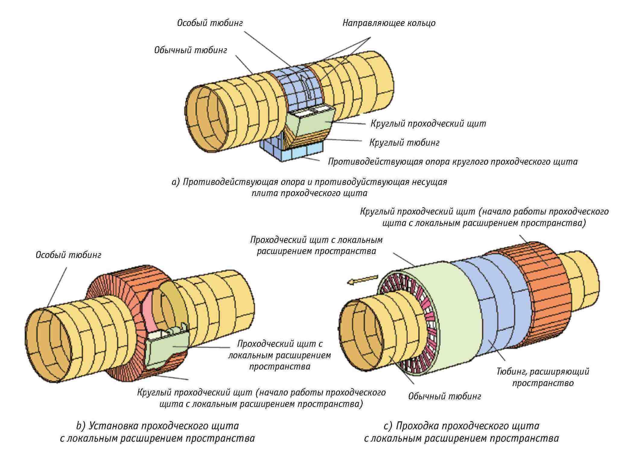 1. Строительные работы на обычном участке. Вначале проводятся работы, характерные для сооружения туннеля, затем на участке, нуждающемся в расширении, устанавливают специальный тюбинг, между обычным и специальным тюбингами устанавливается направляющее кольцо.