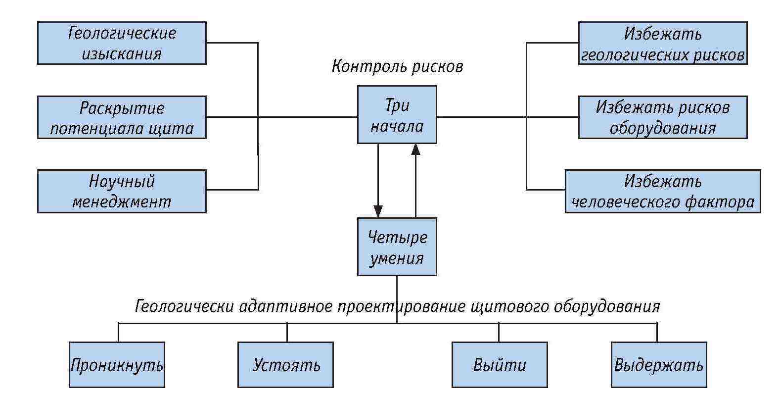 При производстве работ туннелепроходческим щитом необходимо придерживаться концепта «Три начала и четыре умения», под которым подразумевается: «начинать работы с геологических изысканий и контролировать риски при производстве работ щитовой проходкой; начинать c раскрытия потенциала щита и спланировать ключевые позиции щитовой проходки; начинать содействие эффективному результату с научного менеджмента и раскрывать передовые особенности щитовой проходки». Это делается с целью обеспечить «умение проникнуть, устоять, выйти и выдержать» щитовой проходки при производстве работ. Данный принцип описан на рис. 2-19.